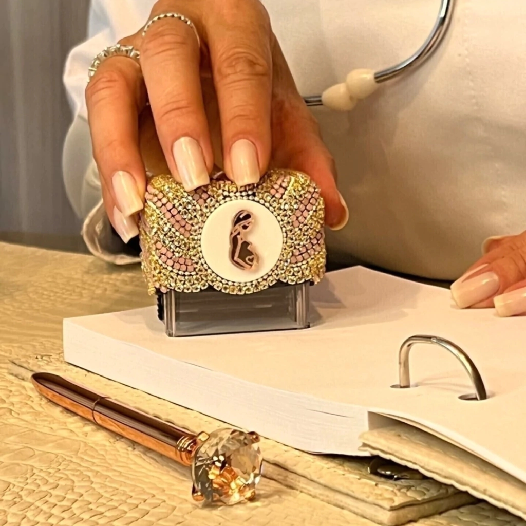 Carimbo de mesa em cristal com rosé e aplique em acrílico espelhado da gestante.