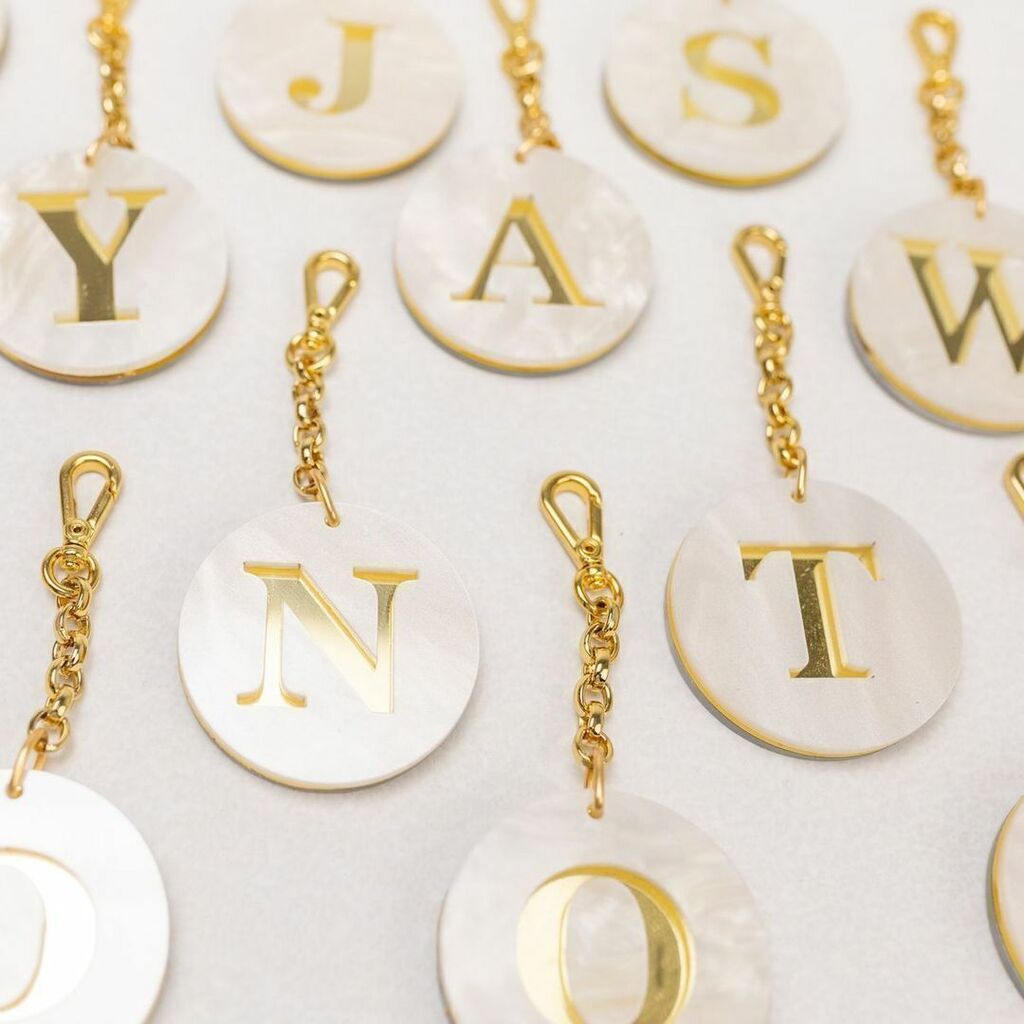 Delicado, peronalizado e cheio de charme! Nosso chaveiro em madrepérola pode ser feito com a sua inicial ou identidade visual, perfeito para brindes personalizados ou para presentear com elegância e significado.